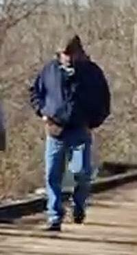 The picture of man on the trestle - looks to me like man wearing ballcap and in blue jeans, a brown shirt with shirttails out and a hoodie under blue lightweight windbreaker. The way the jacket is laying on him it almost appears there is something beneath the jacket in the front. Something that is bulky and causing it to lay funny on him or maybe large items in his pockets causing it to lay like that across his stomach area. Not sure what I think of whatever the thing poking out of the top of the windbreaker is.
