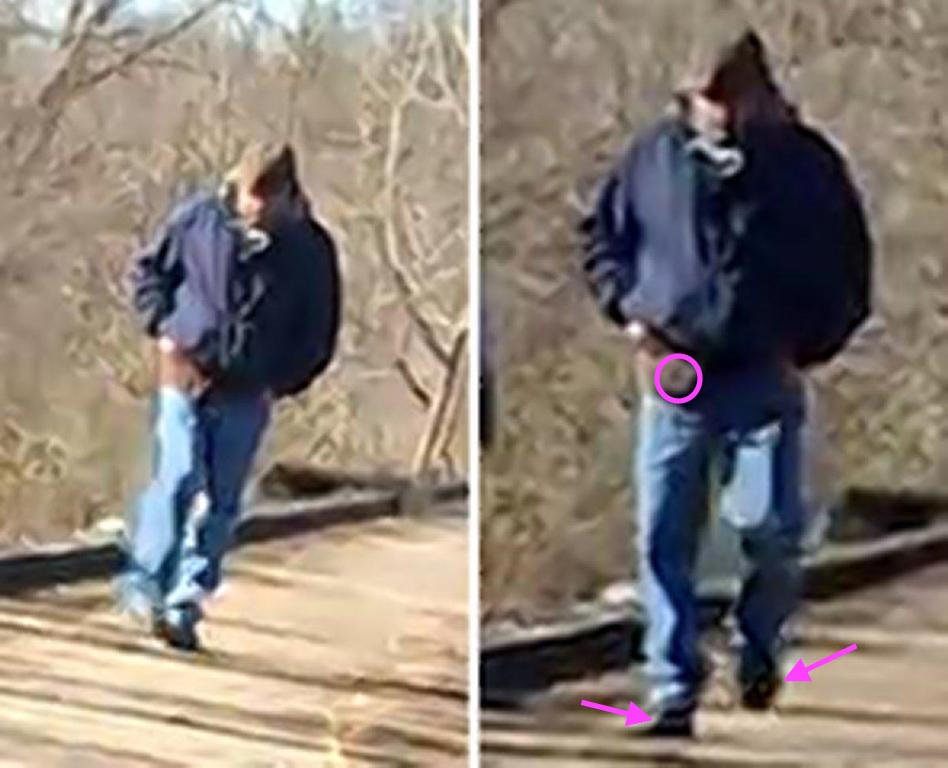I hope this works - new at posting. I was trying to look for different details or things that have not been discussed. Is it possible that the jacket is a pullover, and the white coming out of the top is a plastic bag handle, with the plastic bag making him look much bulkier than he is? Does it appear that there is a logo on the fanny pack/belt thing? Also, the footwear looks unusual to me in terms of the white band on one show and the white spot on the other, and/or the position of his feet. I understand it is possible they were photoshopped by LE, but perhaps something to think about? I placed a circle/arrows on the image below.