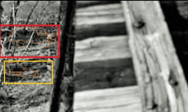 I had to look at those very long and hard before i saw a old 1970s box shaped pickup truck in the red box and a 1970s firebird type car with the hood open in the bottom one. they both look like junked vehicles, except more tha that IMO they look like cloud images. like when you see a shape in the clouds, except in this case it's in teh trees. But at least I finally do see those shapes and can finally understand where some people are getting this idea from.