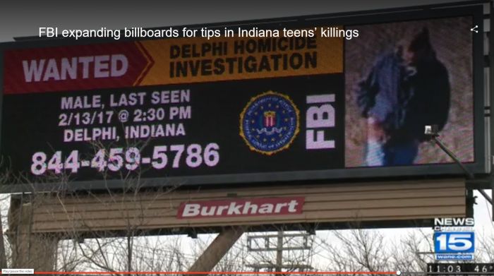 At this moment I am at the rest stop on I-65 closest to the exit to Delphi. There is no photo of the suspect or anything at all posted on the information boards inside or out.