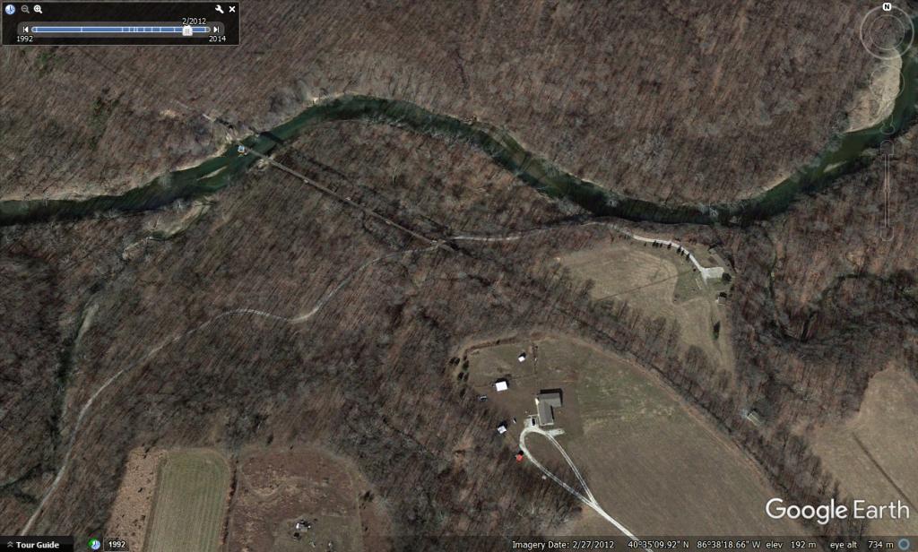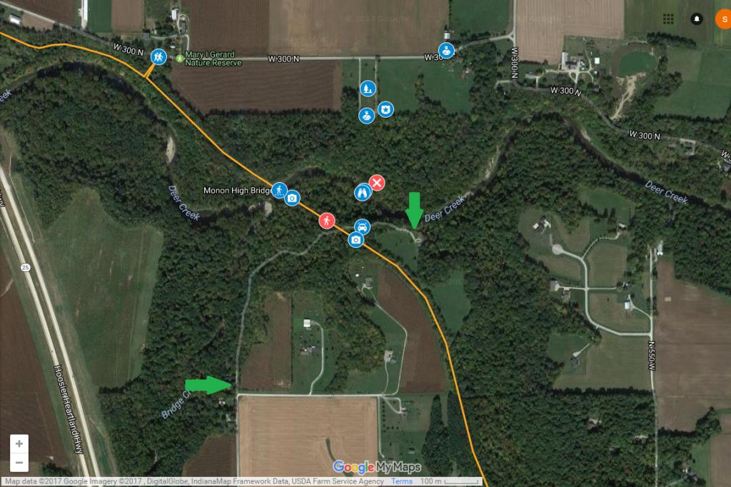 Here is a quick visual regarding the properties surrounding the Monon High Bridge. Notice, almost all surrounding property is privately owned. The big red S marks Indiana State land. The trail and half of the NW part of the High Bridge is Carroll County property. The other half all the way to past the SE end of the bridge is CSX property. I have not noticed that before: