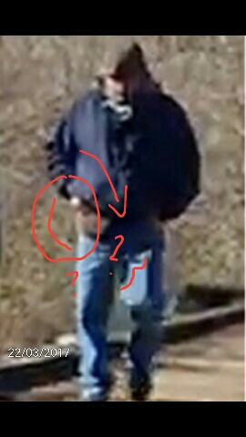 Oh gee Nin, now when I concentrate on the brown hoodie sticking out of the bottom of his jacket, I swear I can see the outline of his family jewels. Especially when it's GIFing. I have thought in past threads and have posted that maybe he was flashing them. Now I'm thinking again, what if he flashed them as they past him on the bridge, then followed them leaving "little John" outside his pants, but under his hoodie?