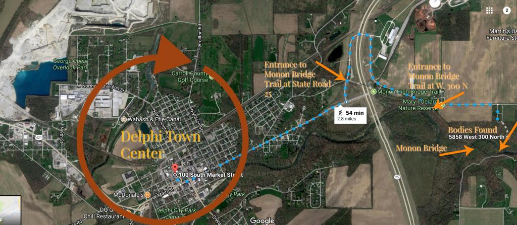 I know all of the above has been reviewed before, but when I look at where the murders took place, in relation to the center of Delphi, I have to wonder if it is coincidence that the killer chose a spot about as far out of the center of town as you can get--and still run into people on foot. In a very small town, he chose one of the most remote corners of that town, And those girls had not walked very far that day. That's a very short stretch of trail they were on--3/4 of a mile at best. How did the killer find this spot? It's well known to locals, but would a stranger to the town, just happening through, find that spot easily?