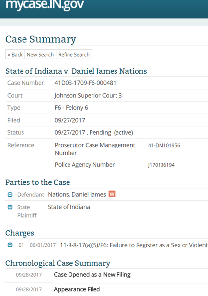 DN has just been charged (on 09/27/17) with a failure to register as a sex offender in Indiana, per below.