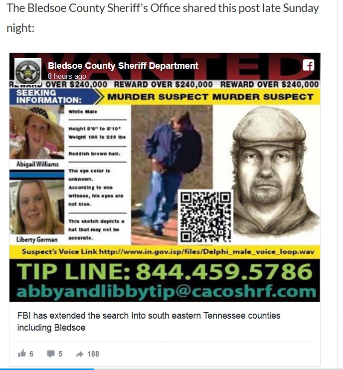 Doesn't sound like it's to expand info. Sounds to me like the FBI is zeroing in on Bledsoe Co, TN. Hard to say though. Both articles timestamp per my search were released between 3 a.m. and 5 a.m. EST this morning, which is an odd time to release news unless it's of a breaking nature. It doesn't say breaking news in the articles though.