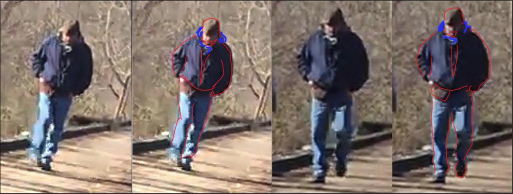 Here is what I'm seeing. After studying these I really cannot be sure he has a hat on. IF it were a baseball cap because of how light and shadow work, we would expect to see the top of the bill very bright. The light would create a very obvious shape from the hat part to the bill which we do not see. It is possible if he is wearing a hat that it could be more of a newsboy style cap with just a slight bill. Otherwise he's wearing no hat at all. You can see in both images the hood is down, I've marked the hoodie in blue. Again, a light colored hood up over his head would be very bright in contrast with his skin. We can assume the hood is down in both pics.