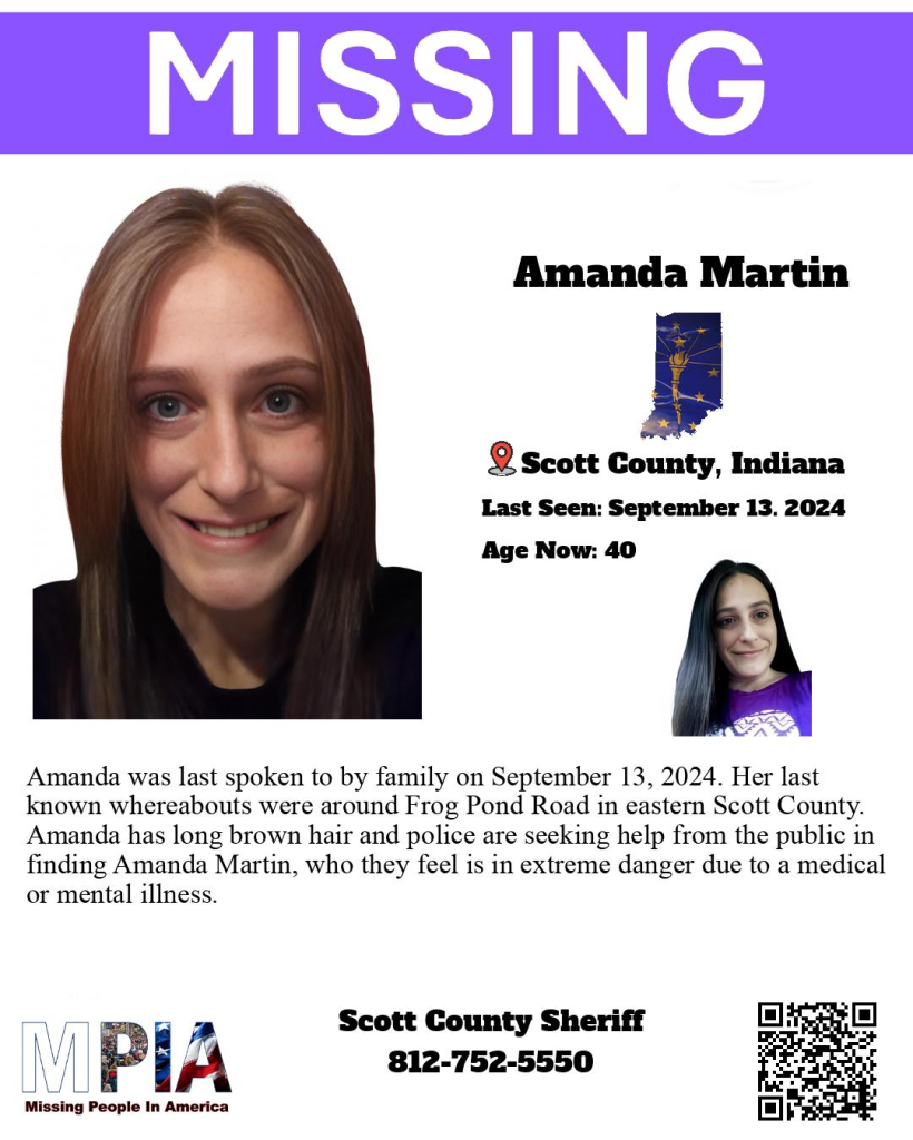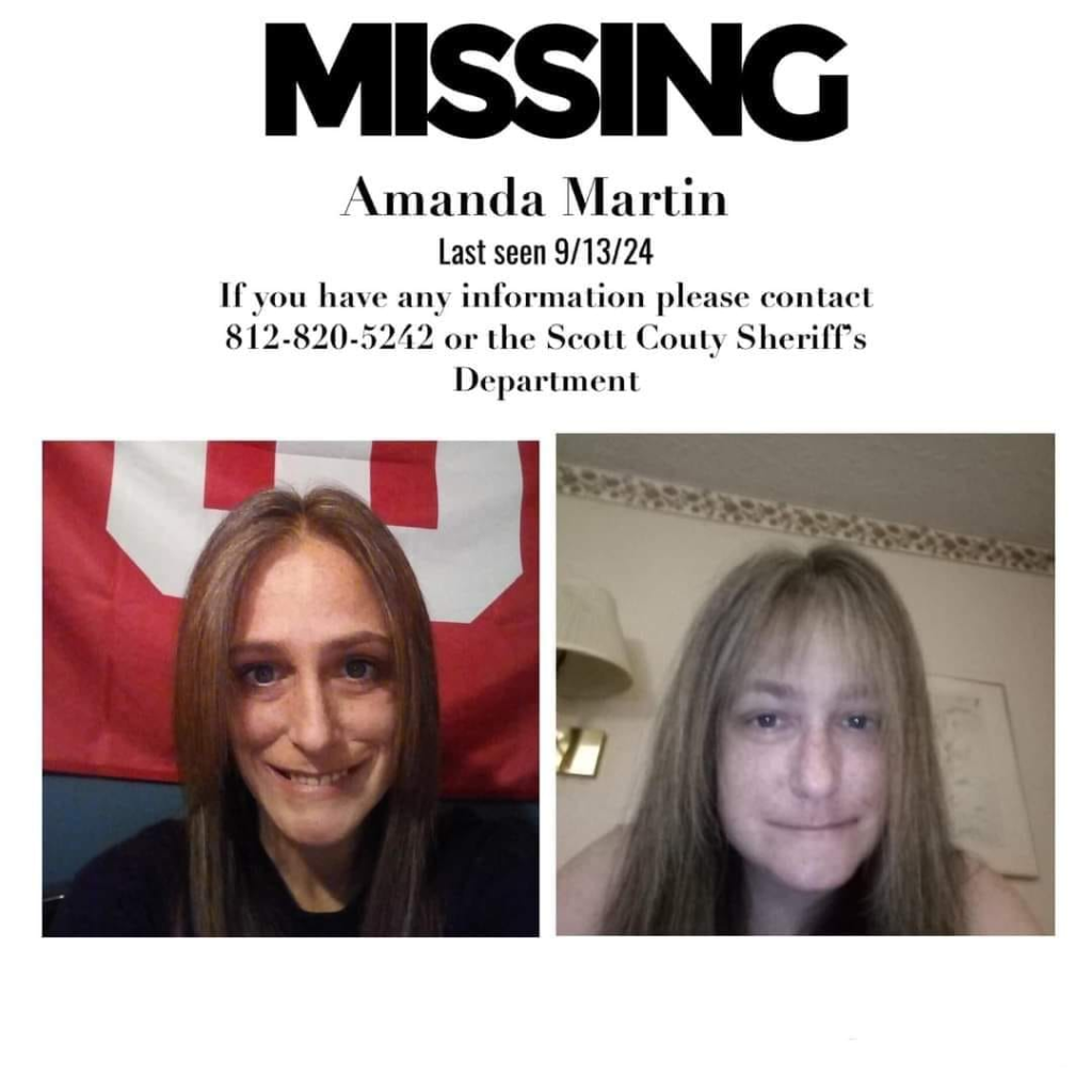 October 12 at 12:40 PM ·Amanda was last spoken to by family on September 13, 2024. Her last known whereabouts were around Frog Pond Road in eastern Scott County. Amanda has long brown hair and police are seeking help from the public in finding Amanda Martin, who they feel is in extreme danger due to a medical or mental illness.