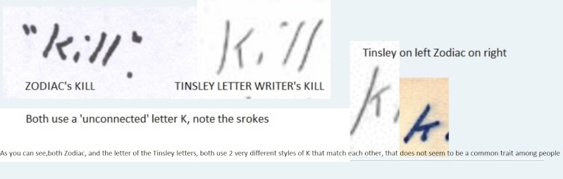 Somebody earlier mentioned a similarity in the Tinsley case writing to that of Zodiac. I agree, and found something compelling, both writers use 2 different kinds of k's, and they all match between both writers-