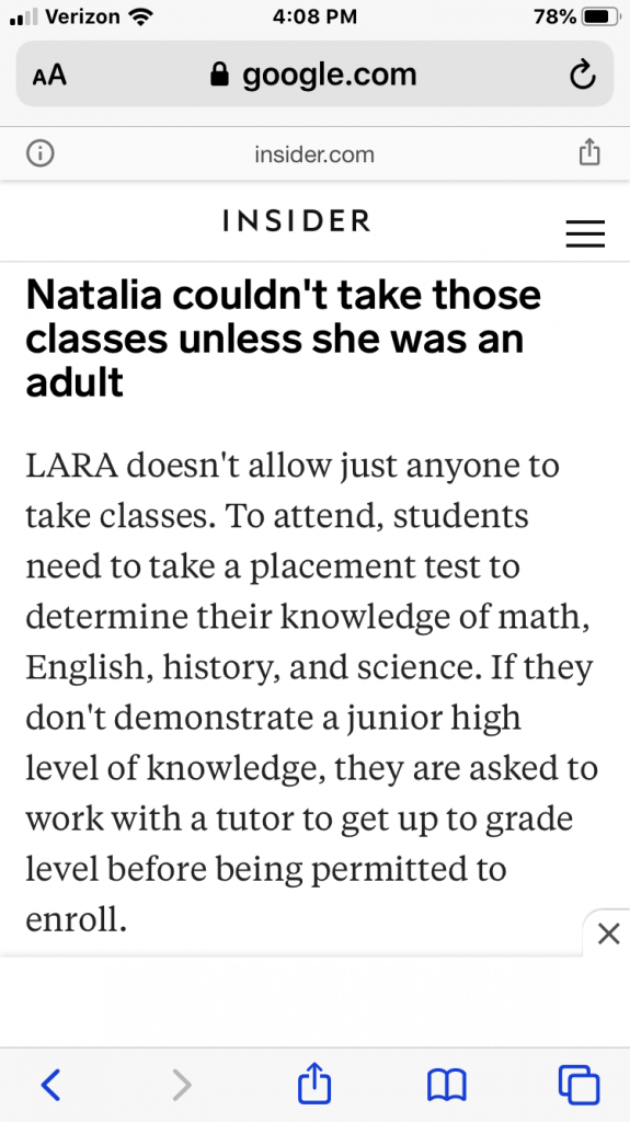 Yes. That’s what they set her up with. It’s the LARA program. It helps them get their GED, learn English and life skills. It also enables them to undergo testing to determine what they need to work on and whether they’re ready for college.