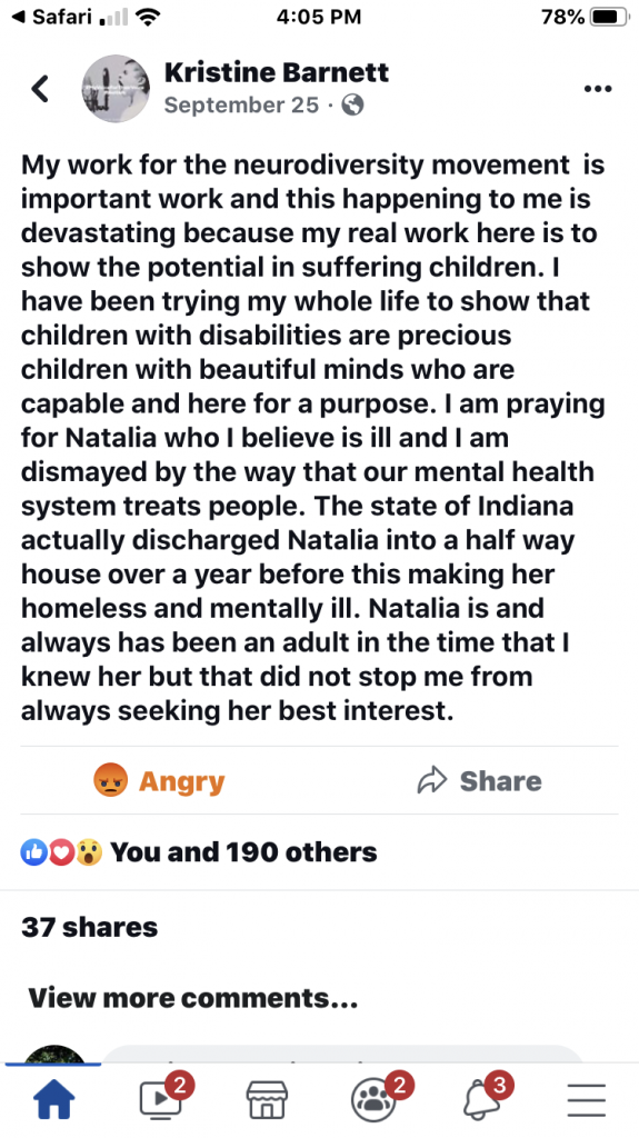 Kristine first said that when NB was discharged from the hospital (this would have been approximately July/August 2012) that she was discharged into a “half way” house. I’m attaching her post to prove these were HER words, not just a reporting of her words). In other reporting, it was stated that Natalia was, after discharge, under the care of Aspire of Indiana. Here is a screenshot of the housing services they provide and it aligns with Kristine’s admission of “half way house.” I think this proves that Natalia WAS NOT truly on her own for a year, before they put her into the LaFayette apt in July 2013. FDE39ADA-5614-4BA5-ACFF-988D63193EBE.png4D9B327E-1343-432E-B4FA-20522FF3A946.png
