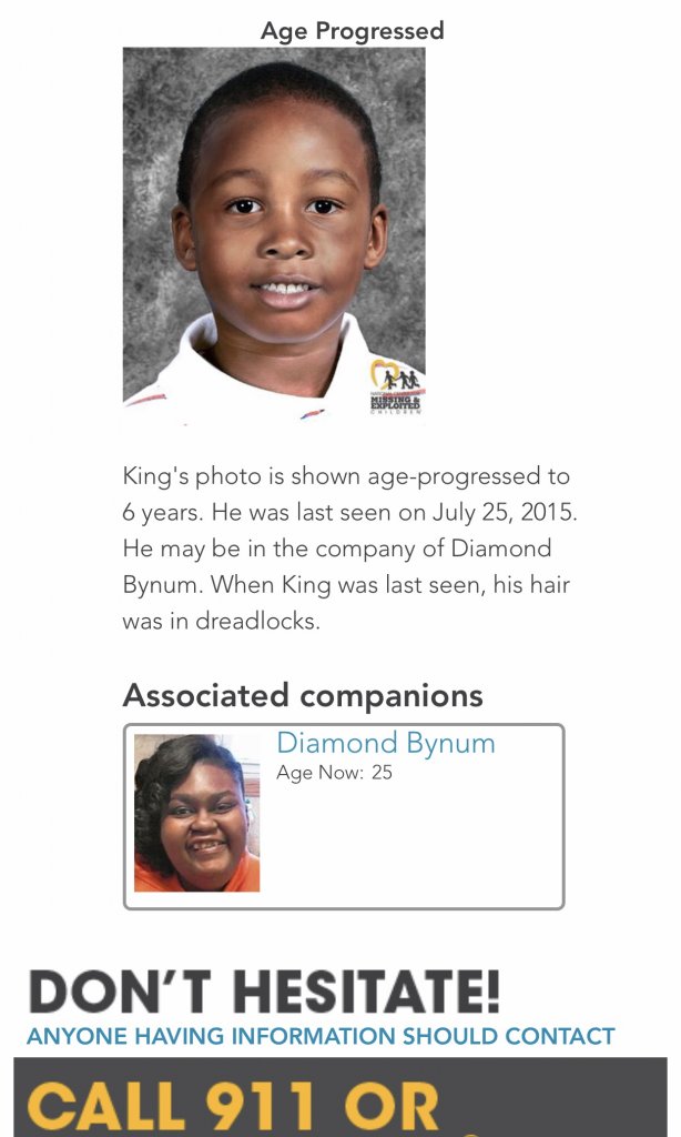 King's photo is shown age-progressed to 6 years. He was last seen on July 25, 2015. He may be in the company of Diamond Bynum. When King was last seen, his hair was in dreadlocks.