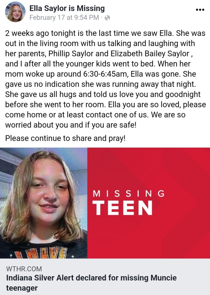 According to the Indiana State Police, she is believed to be in extreme danger and may require medical assistance. The Saylor family told NewsLink Indiana that Ella struggled with mental health issues.
