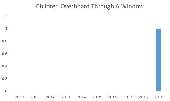 I have been unable to find one incident of a child falling overboard out of a cruise ship window. I have looked on a couple of cruise ship incident statistical websites and trawled the internet.