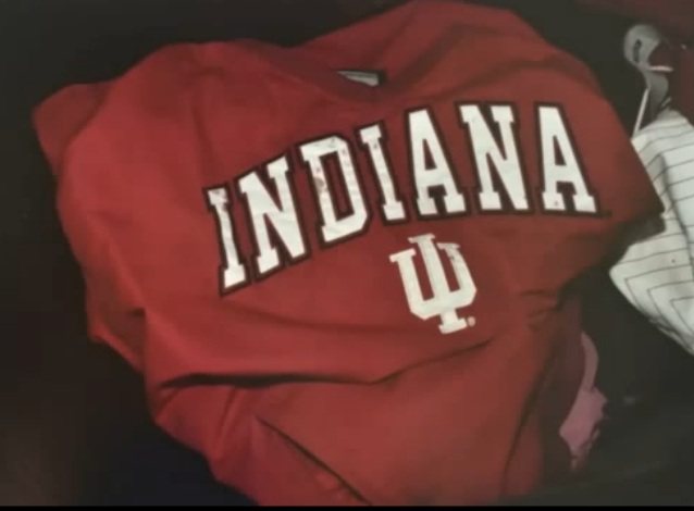 Okay, now you have me thinking, Maybe he did have a "Campus Security" shirt, but then he got blood all over it, and disposed of it. Unable to find another; he started wearing the "Indiana University" sweatshirt.
