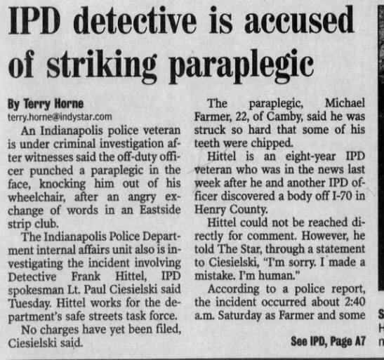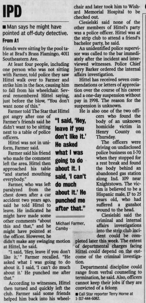 This article from the Indy Star discusses a situation the detective in this case encountered where he hit a wheelchair-bound man in the face. I find this story peculiar in a way that it could somehow be connected to this John Doe.