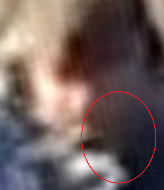 See where the line is? That is an actual change in the pixels (?) that separates the face. The part of the face to the right of the line is higher than the left and appears to be pulling away (from movement?). So with the face not lining up, if you follow the line up, it now makes sense, imo, why the "hat" is so tall on the right side (higher). So, I duplicated the picture and cropped the right part of the face. I lined it up to match the left side. Here's how it turned out.