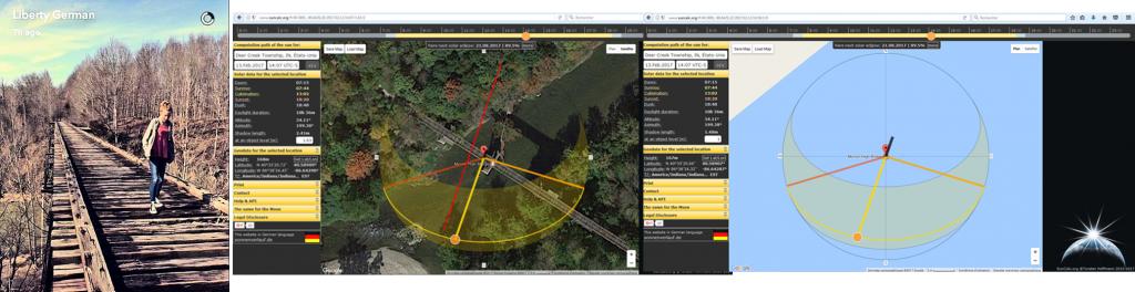 After, I linked two red lines created by shadow of Abigail at 14:07PM and shadow of BG at 14:58PM and placed it on compass scheme. Next, I drew a blue line, parallel to the shadow of Abigail which I compared also to the shadows of the trees from the image. On a same image (Abigail’s) I drew another blue line parallel to the bridge boards (BG shadow). I connected both blue lines and place it on compass scheme. We can see the same time frame between two shadows expressed in degrees in both cases.