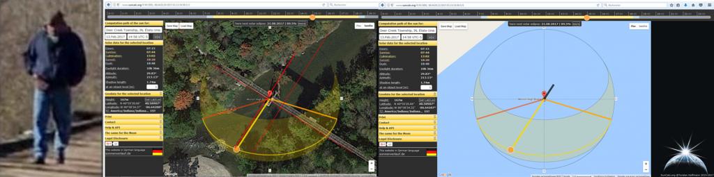 This is how I did it. First, I set time for 14:07PM and location for Monon Bridge, Delphi, Indiana. I drew a red line, parallel to shadow for further comparison.