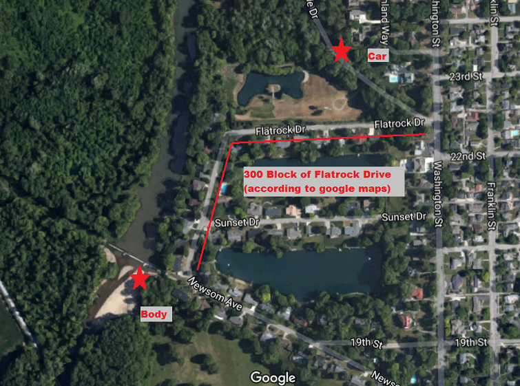 A) runs due west, falls in river, drowns and floats over the dam and lands on sandbar? Dead bodies don't float until gasses build up weeks later.