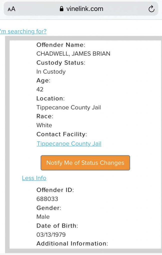 He was arrested 2020 in Peru.30 minute Drive from where he works/lives , Lafayette to Delphi