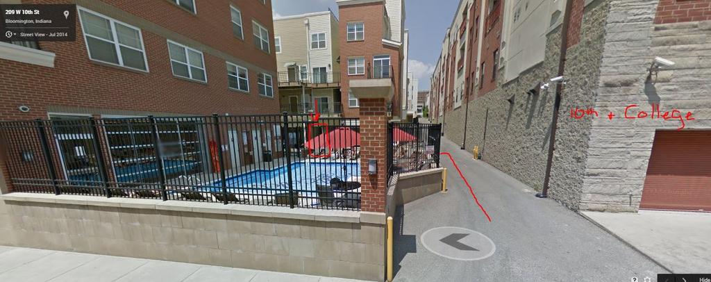 looking at chuz' map, you can see that the north, long end of the pool opens up into the courtyard and directly across from it, in the courtyard, is the staircase you circled because I saw it there. On theleft side of the pool, you can see the clubhouse wall.