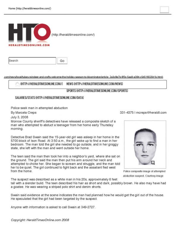 I think there may be a link between DM and Lauren, and possibly Marina Boelter. First, I search the archives of the local Bloomington newspaper, the Herald Times, and the IU newspaper, Indiana Daily Student, for articles related to sexual assault reports between 2000-2012, and focused on the ones with police-generated composite sketches. Check out the following 3 sketches, they all seem to look like it's the same person assaulting women between 2005 and 2012: