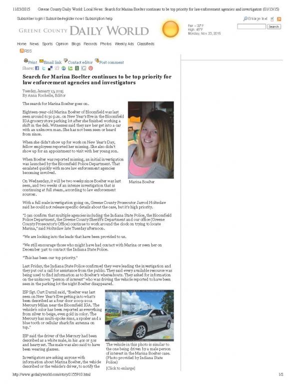 It gets better: Marina Boelter was an 18 year old young mother who disappeared from Bloomfield, Indiana (about 20 minutes west of Bloomington) on 12/31/14. She was last seen by her ex-boyfriend (who adamantly maintained his innocence in her disappearance until he died a few months later from a stab wound during a fight) getting into a vehicle he described as a silver four-door sedan, possibly a silver Mercury Milan, driven by a "middle-aged heavy set male":