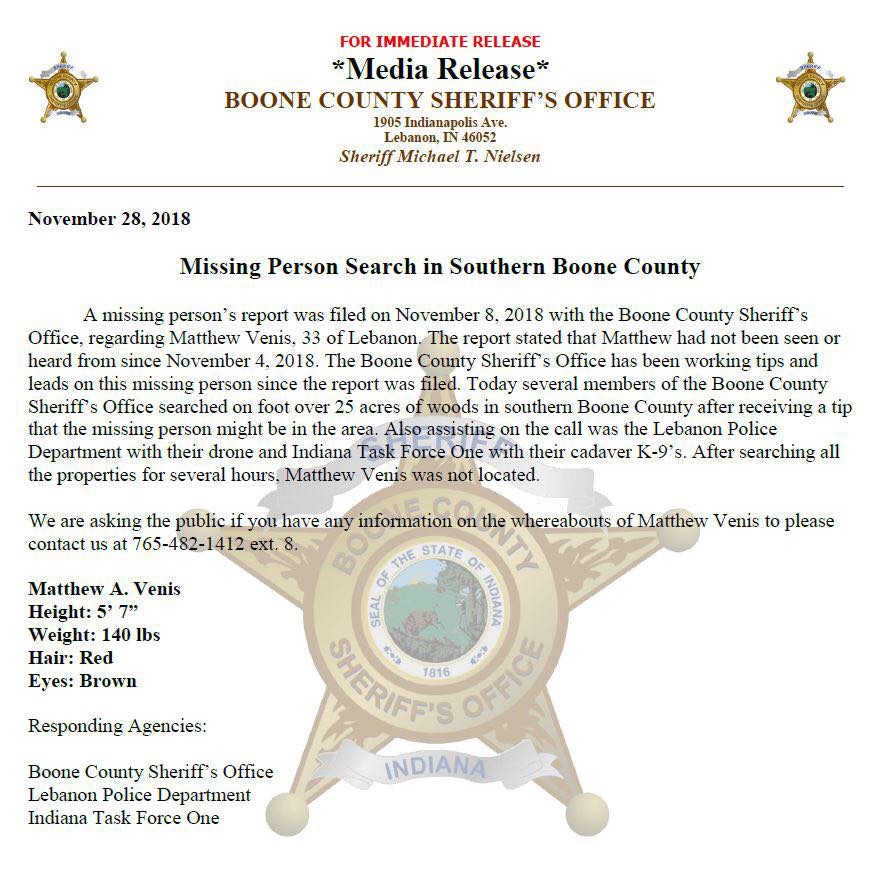 A missing person’s report was filed on November 8, 2018 with the Boone County Sheriff’s Office, regarding Matthew Venis, 33 of Lebanon. The report stated that Matthew had not been seen or heard from since November 4, 2018. The Boone County Sheriff’s Office has been working tips and leads on this missing person since the report was filed. Today several members of the Boone County Sheriff’s Office searched on foot over 25 acres of woods in southern Boone County after receiving a tip that the missing person might be in the area. Also assisting on the call was the Lebanon Police Department with their drone and Indiana USAR Task Force #1 with their cadaver K-9’s. After searching all the properties for several hours, Matthew Venis was not located.