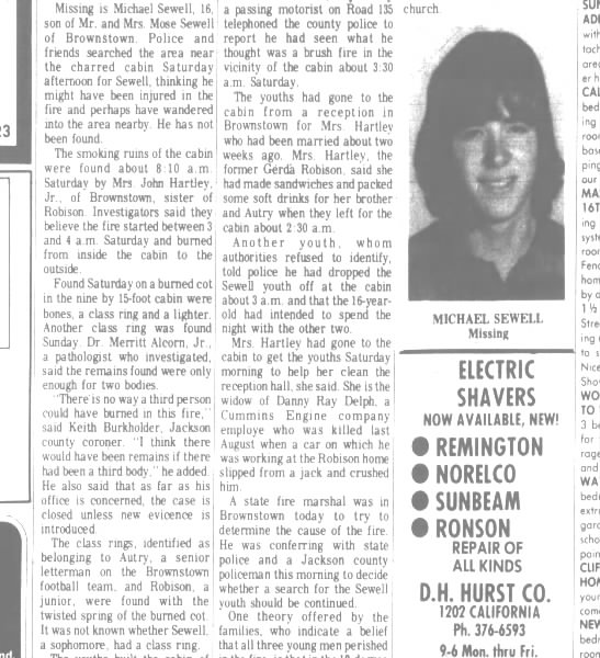 ''A third teenager, 16-year-old Michael W. Sewell, was camping with the pair the night of the fire, but police reports from the time indicate only two bodies were found.