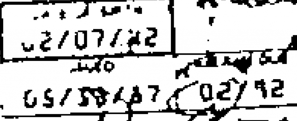 My guess is the lower left date is 5/xx/87. The reason I believe it is a 5 is because the number 9 in the lower right box has a “straight line”, it does not curl in like the number in the lower left box. Hope this makes sense.