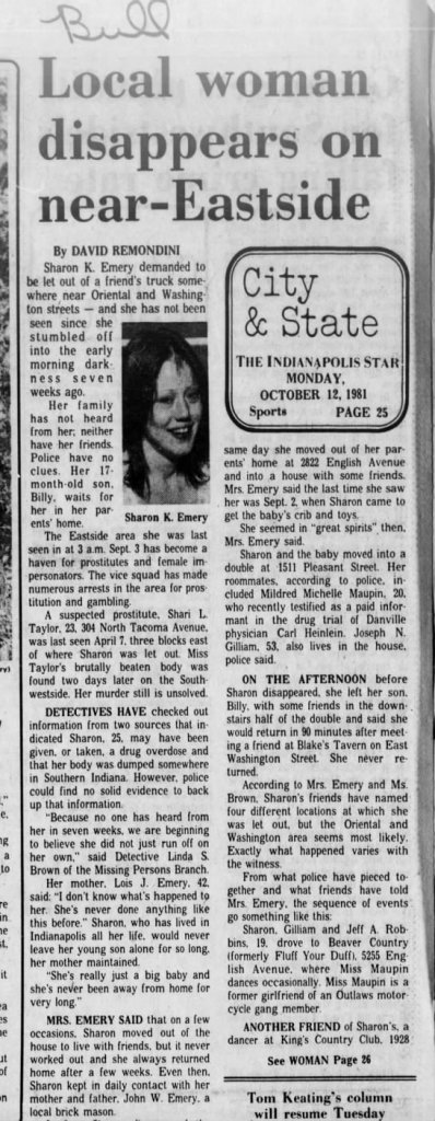 Emery was last seen in the vicinity of east Washington Street and north State Street in Indianapolis, Indiana on September 3, 1981. She lived with a male roommate and had been out drinking with him that night. Her roommate stated she left after an argument at 3:00 a.m.
