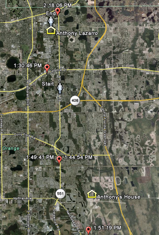 The pings support the possibility ... possibility mind you (don't make me put another graph up there :nono:) ... that KC could have been at her parents for as long as 15 minutes on the 20th. Her 1:30 ping places her on the road well into her trip to the 'rents, 13 minutes out. Her 2:18 ping places her back at Tony's, or awfully close to there. So she could possibly have gotten there at 1:44 and then left at 1:58 (OK, 14 minutes not 15 :rolleyes:). A quick trip, but so was her trip on the 24th.