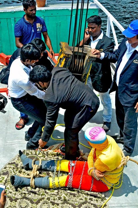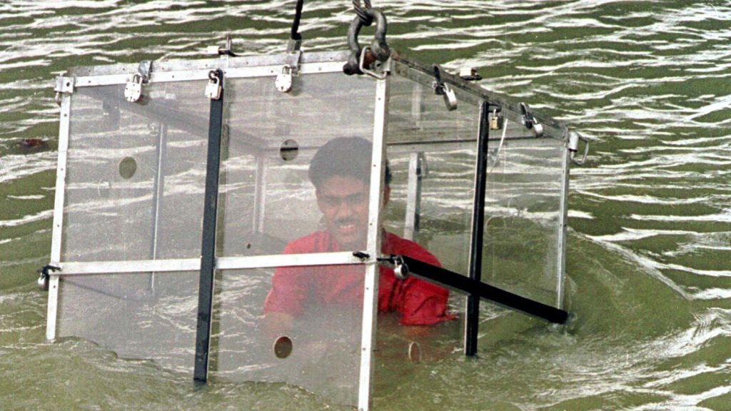 Chanchal Lahiri being lowered into the River Hooghly in a glass cage box in 1998