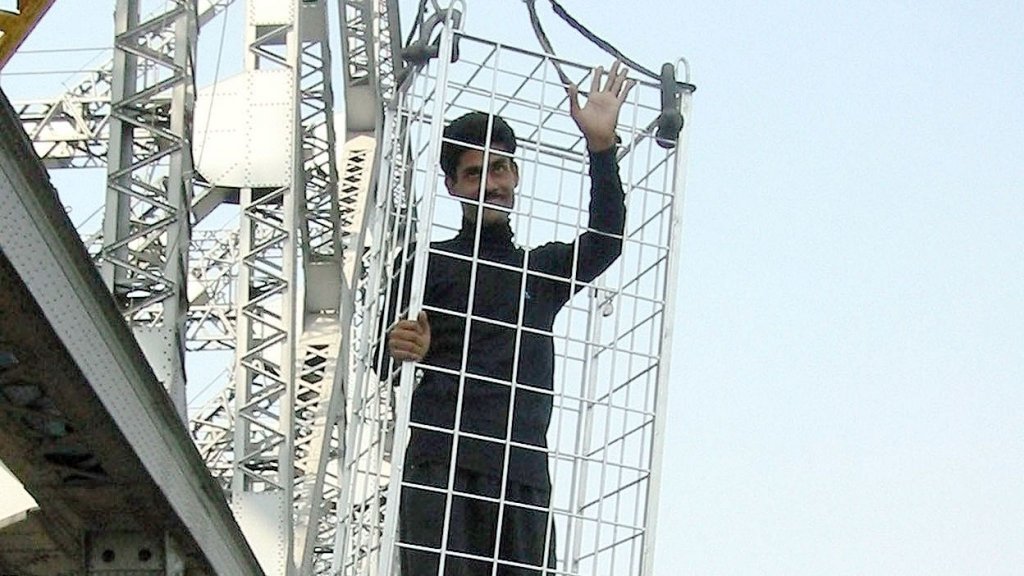 Caged Indian escape artist Chanchal Lahiri waves to the crowd before being lowered into the Hooghly river in 2002