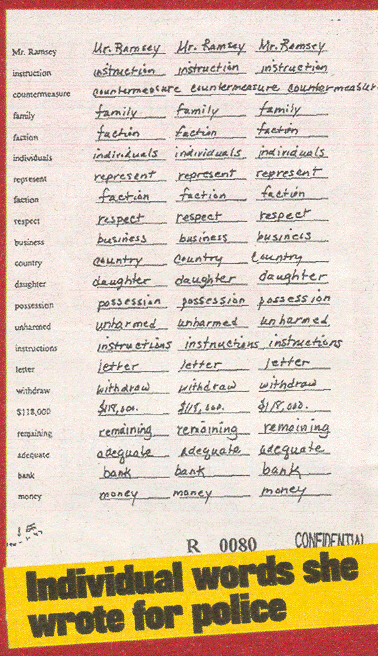 ransom written by right hand, looks natural ; Patsy`s left handwriting looks as left handwriting expected to look, very unnatural