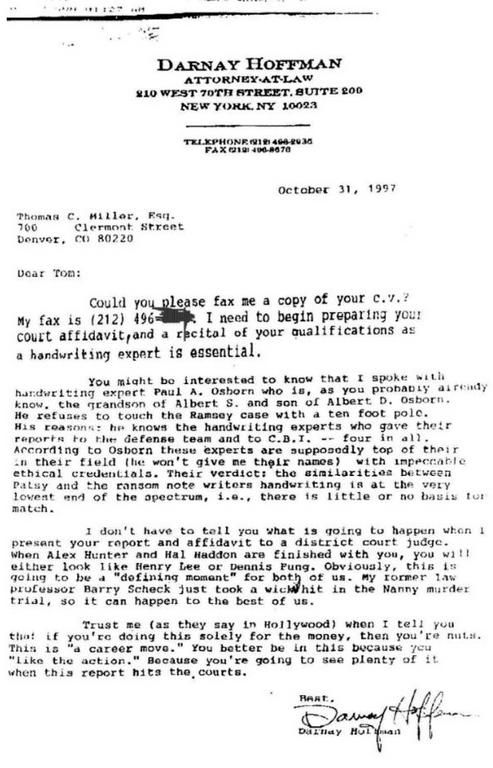 Hoffman (Wolf’s lawyer in suit) notes in a fax that these experts said, “the similarities between Patsy and the ransom note writers handwriting is at the very lowest end of the spectrum, i.e., there is little or no basis for match."