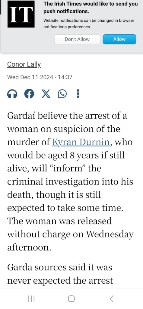'His arrest came just 24 hours after a woman known to Kyran had also been arrested and released without charge. The woman, who has denied any involvement in Kyran’s disappearance, had previously implicated Maguire.' Irish Daily Mirror.