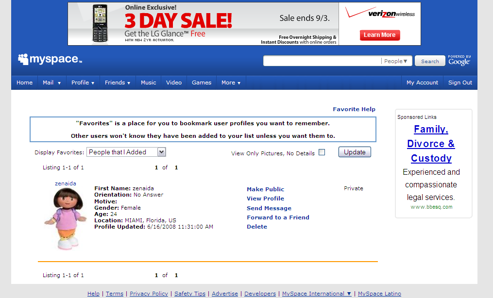 6/16/08 MON 11:31:00 AM "zenaida" makes her last profile update