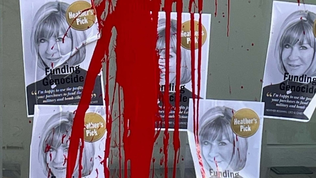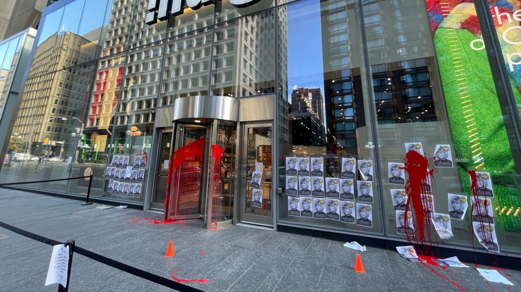 Footage from CP24’s cameras show dozens of posters bearing the image of Heather Reisman alongside the words “Funding Genocide” outside an Indigo store near Bay and Bloor streets.
