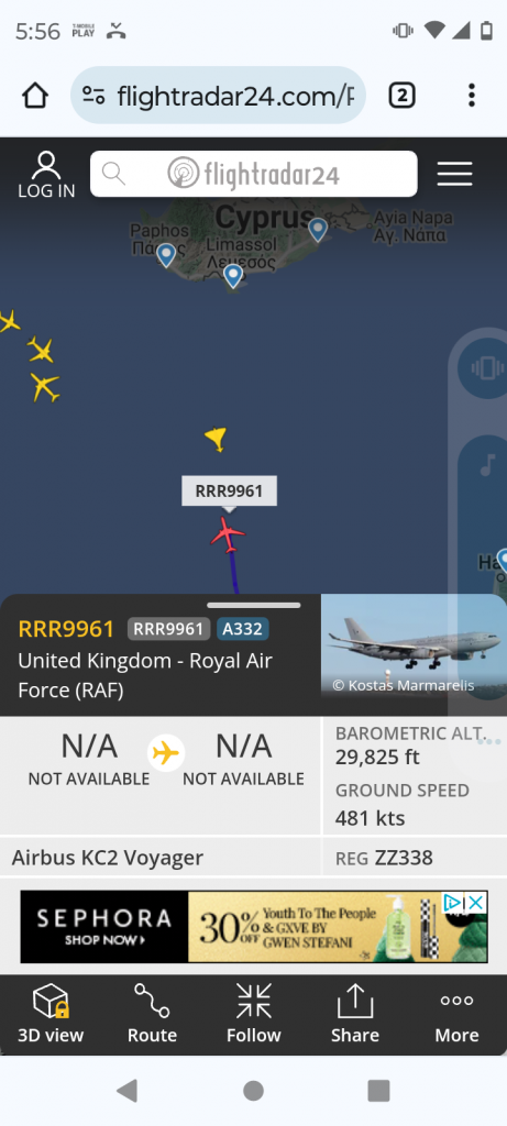 Both are landing in Cyprus. Took off from Jordan. I don't know what they're doing. Jordan and UK are close allies though. Both flew over Israel's airspace???