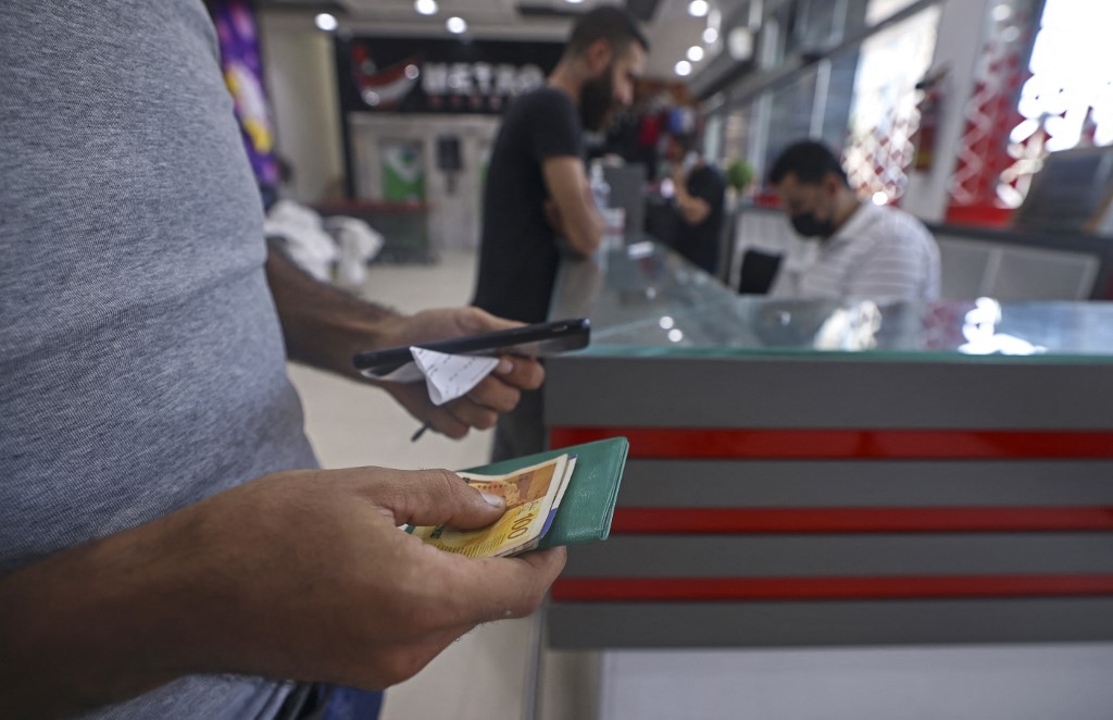 A Palestinian man receives financial aid at a supermarket in Gaza City, on September 15, 2021, as part of the UN’s Humanitarian Cash Assistance program, supported by the state of Qatar. (Mahmud Hams/AFP)