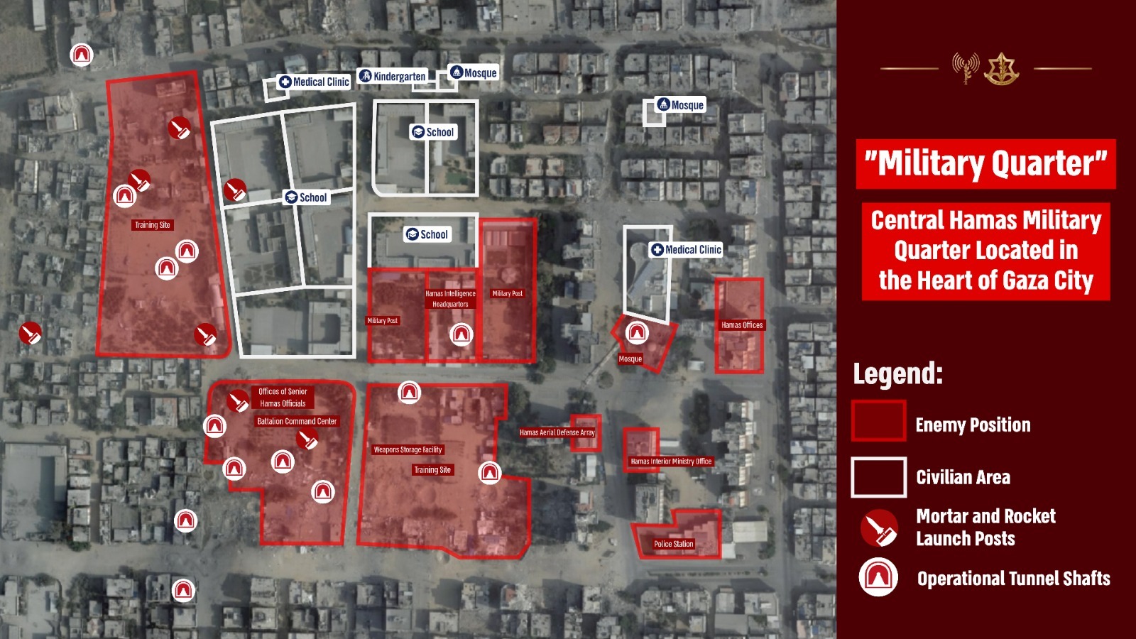 The IDF says the largest Hamas training camp is also in the quarter, along with other military positions, weapons manufacturing plants and warehouses, command centers, offices of Hamas commanders, and underground infrastructure — all embedded in the “heart of the civilian population.”