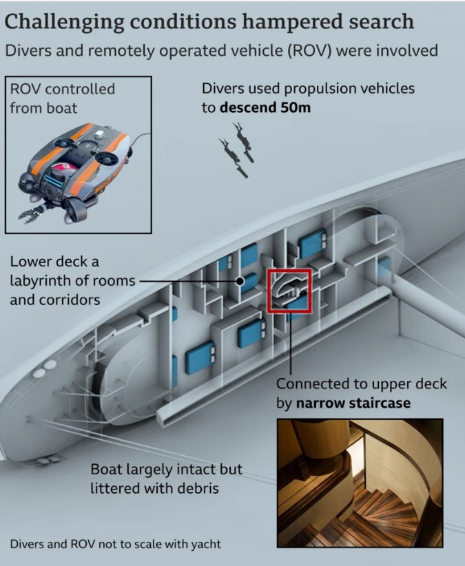 Perhaps the stairway became blocked and they ended up there because there might have initially been an airpocket for a short window of time.What I take from that is that poor Hannah Lynch slept through it and died in her cabin whilst at least three of the other five, including Mike Lynch, were trying to escape when the yacht sank. By the first cabin on the left I take it this means the cabin on the left nearest the bow. This cabin is right next to the stairway up to the deck. If the yacht was rolling to the right and sinking by the stern, why head for the cabin to the left of the stairway rather than the stairway itself?