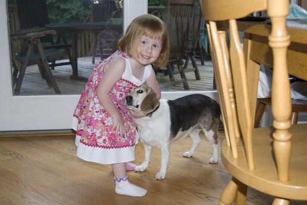 Our little Susie was six when our daughter was born. She was incredibly protective of the baby as she grew, and she loved nothing more than curling up in bed with her - with the possible exception of giving her kisses. She was patient when the baby and then toddler tugged at her ears and tail, and sometimes hugged her too tight. She would allow her to walk her outside on a leash and would not tug, even though when I took her out she would pull like mad.