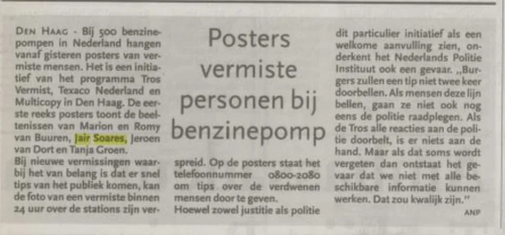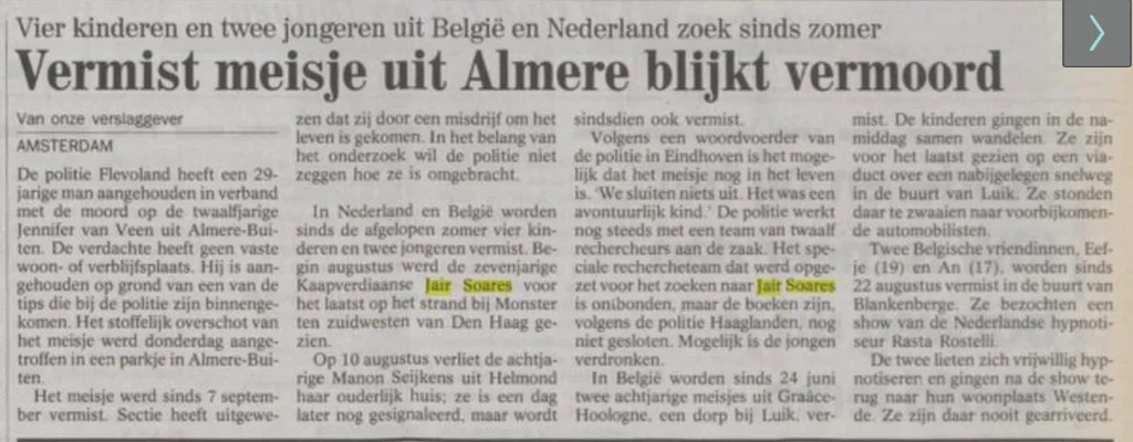 The search the area, soon accompanied by the police and the rescue brigade. The search is in vain, as are the searches that have taken place in the last 24 years: no trace of the child has been found. That he ran into the sea or that he ran away is virtually excluded: the water was cold, and Jaïr was very aware that he was not allowed to stray just like that.