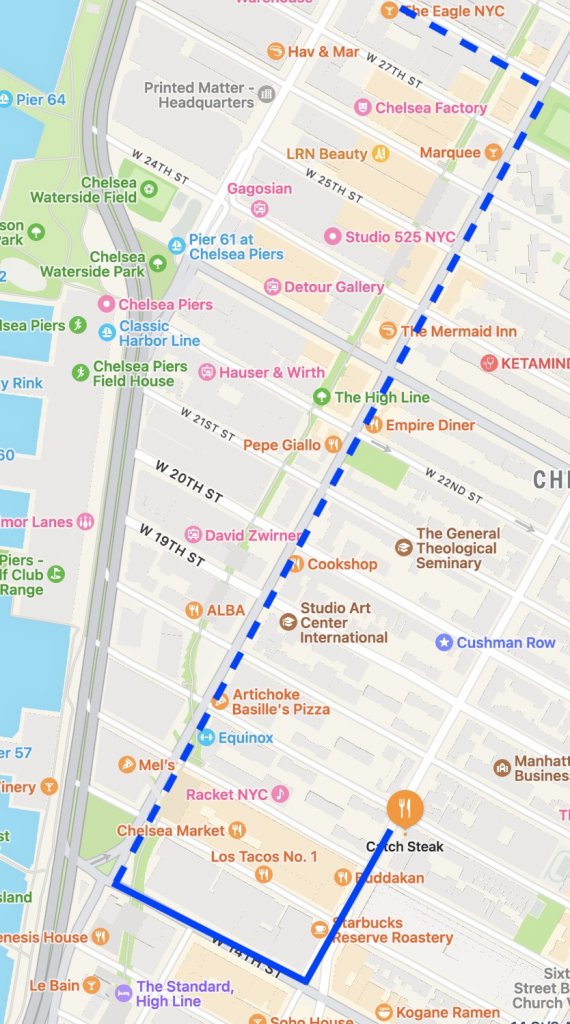 The map below illustrates what I mean (solid blue line for the cab ride, dotted line for on foot).