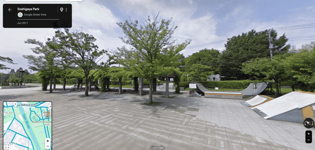 The skatepark is across from the house. The playground is for kids which is directly behind it. Could you use that for skating? I suppose so but that's something I've never seen on any of the occasions I went there / never heard of in the conversations I've had. The first image below is of the skatepark. The second is its relation to the Miyazawa home: