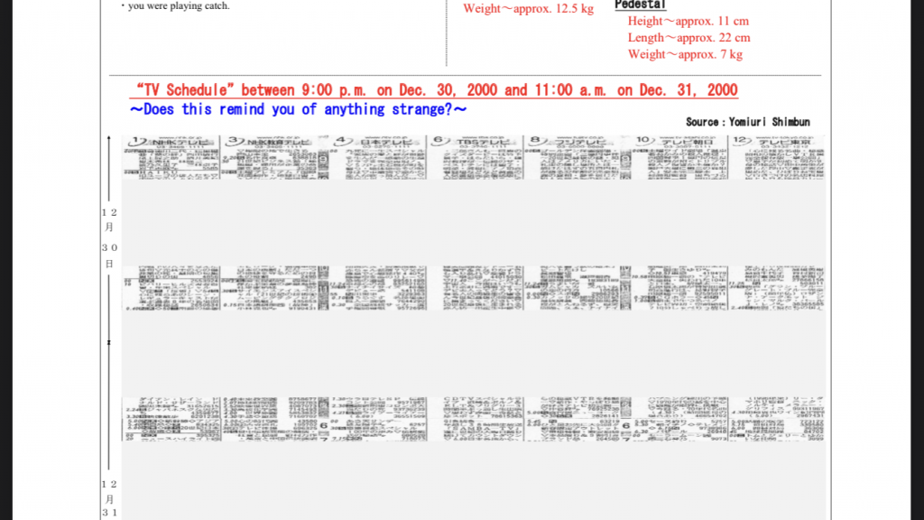 The TV schedule could be important for two reasons. I believe the daughter was next door watching TV in till around 9.30pm? Also I have read that police used TV schedules to identify the timing of the 11.30pm thud that the neighbours heard. However I don't read Japanese and I don't think witness statements are available anywhere so I'm not sure if that info is totally accurate or not. I'm not even sure if the family next door claimed to be awake but didn't hear anything or asleep at the time of the attack. If anyone has any info on the witness testimony from the neighbors next door I'd be interested to read it.
