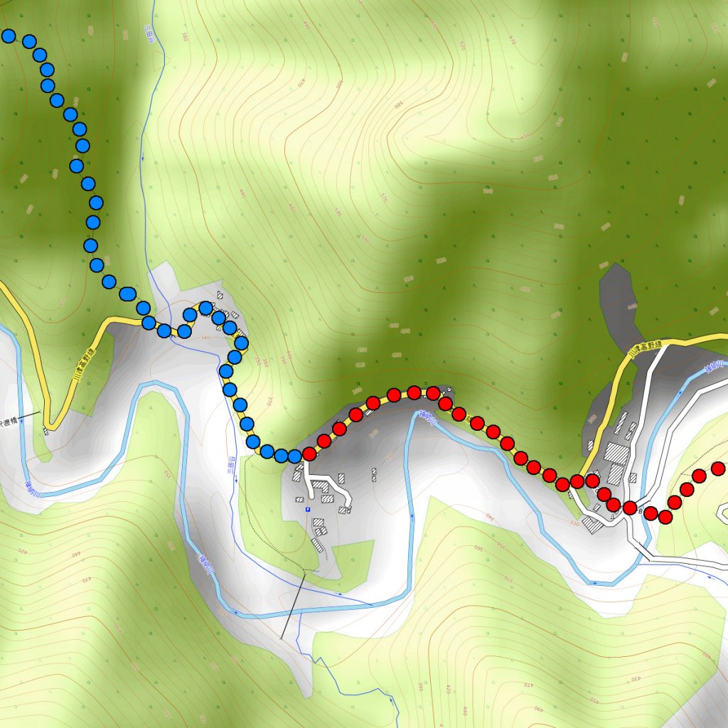 Not accidentally, I'm near 100% sure. From the guesthouse the previous day's hike is in the completely opposite direction. Blue is section 2 (Obako) and red is section 3 (Miura):