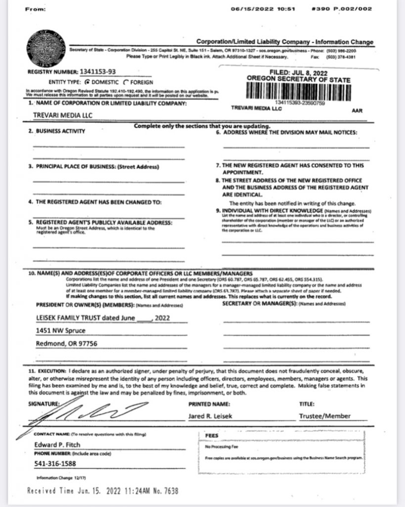 Evidenced as found in this amended doc on his business registration I linked earlier. Signed by Jared as trustee/member.